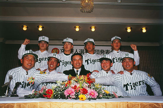 1991年度ドラフト4位で入団。(一列目右端)同期入団には久慈照嘉選手(現守備走塁コーチ 一列目右から2番目)がいた。 (写真協力:月刊タイガース) |