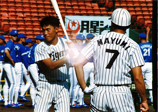 練習中に大ベテランの真弓明信選手(前監督)と。 (写真協力:月刊タイガース) |