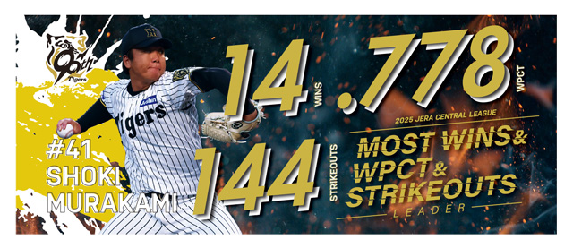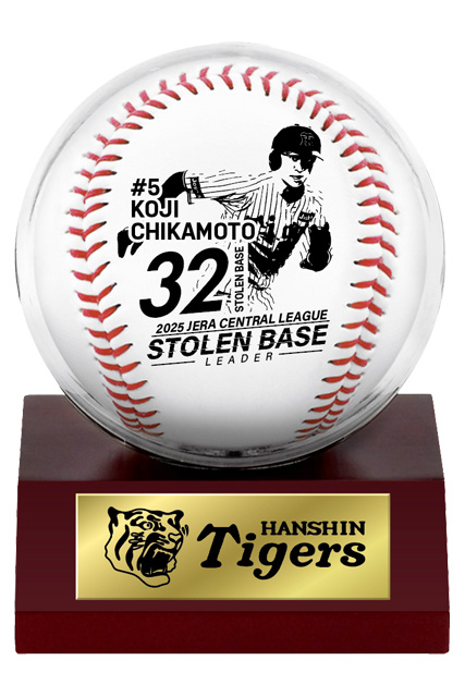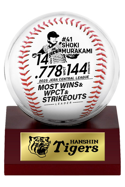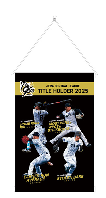 JERA セントラル・リーグ2025年レギュラーシーズンにおきまして、才木浩人選手が「最優秀防御率投手賞」、村上頌樹選手が「勝率第一位投手賞」・「最多勝利投手賞」・「最多三振奪取投手賞」、佐藤輝明選手が「最多本塁打者賞」・「最多打点者賞」、近本光司選手が「最多盗塁者賞」の個人タイトルを獲得いたしました。これらを記念し、記念グッズの販売を開始いたします。