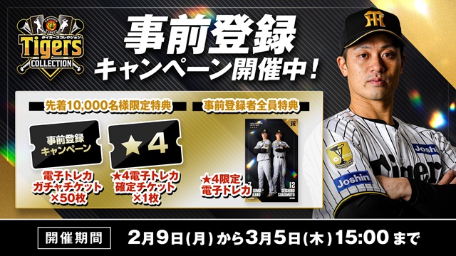 3月6日にサービスリリース予定の公式電子トレカサービス「タイガースコレクション」について、 サービスリリースに先駆けて、期間限定の事前登録キャンペーンを開催いたします!!