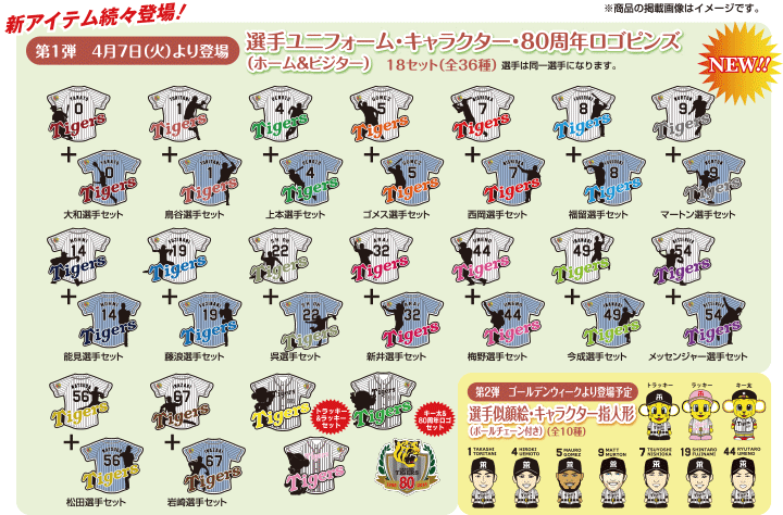 新ユニフォームがモチーフのアイテム「選手ユニフォーム(ホーム&ビジター)・キャラクター・80周年ロゴピンズ」(18セット全36種類)が新登場!